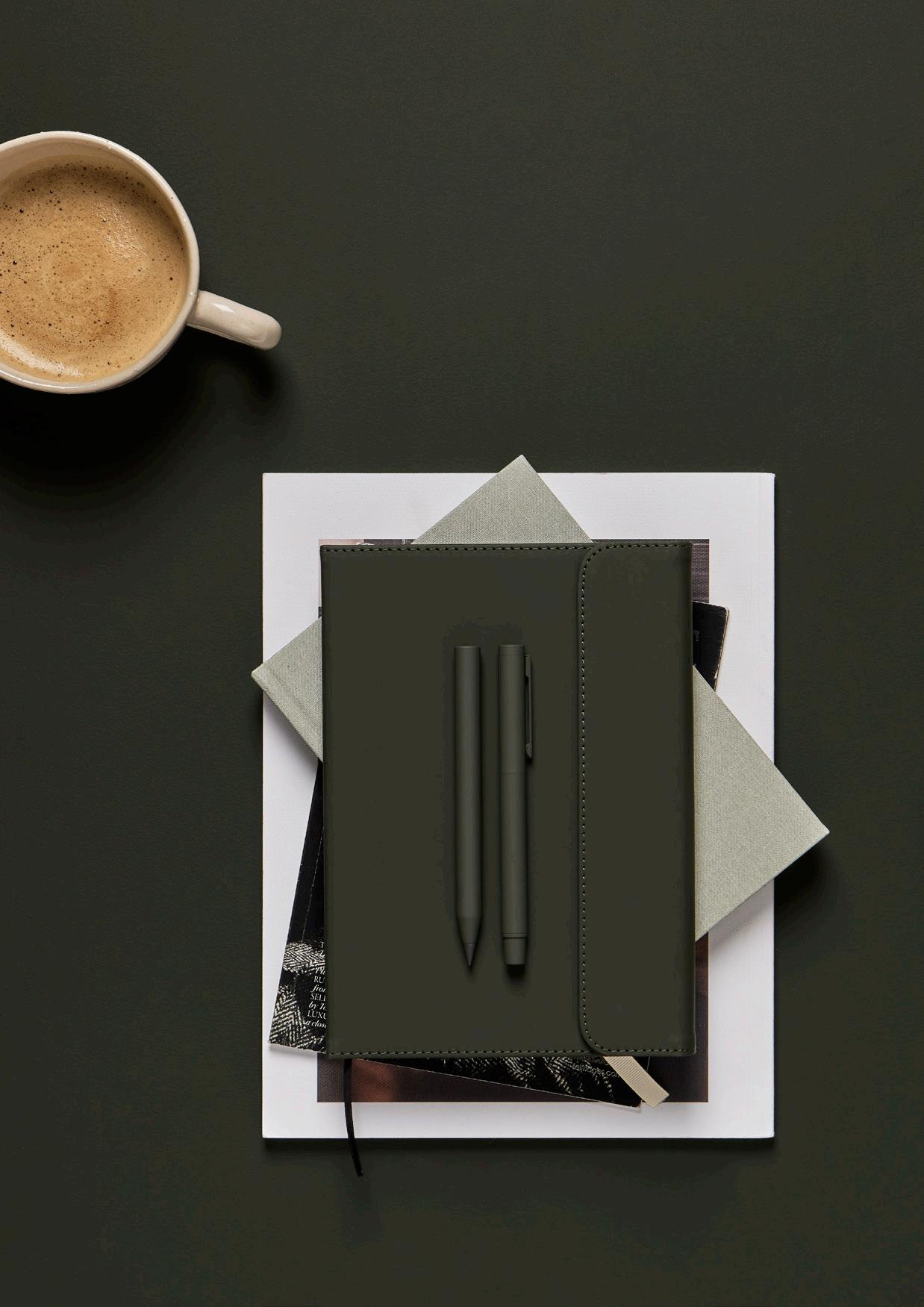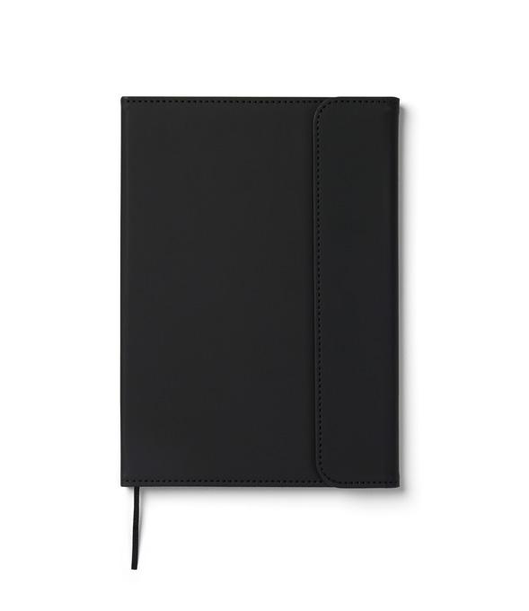 Stilrent PU-materiale • 160 sider • Notablokk cover med mulighet for refill • Med pennholder • A5-størrelse