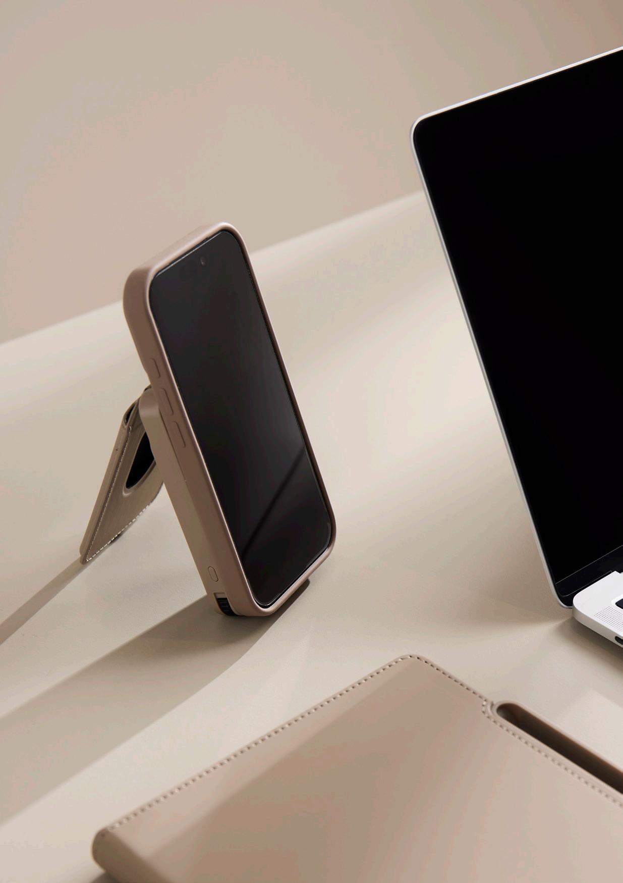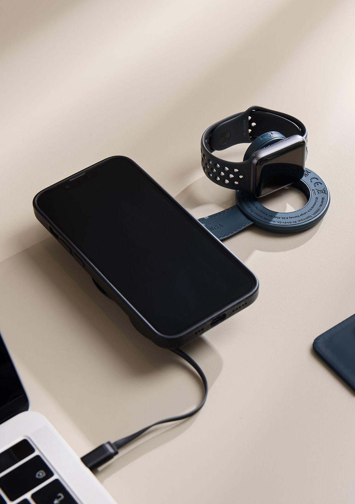 Lad mens du reiser • Kraftig 15 W magnetisk trådløs lading • Integrert ladekabel (Lightning og type C) • Sammenleggbar design • Lad 2 enheter på en gang