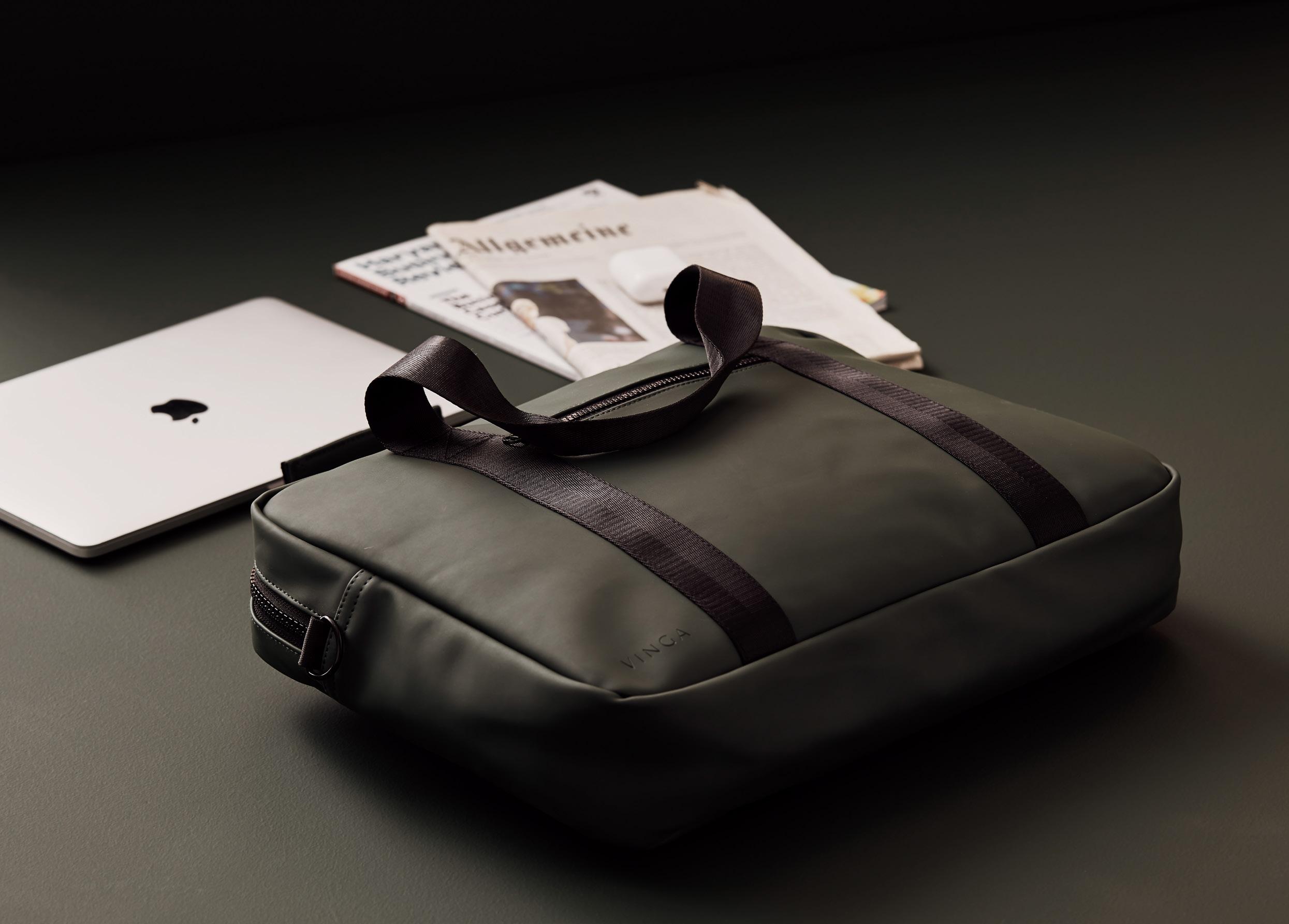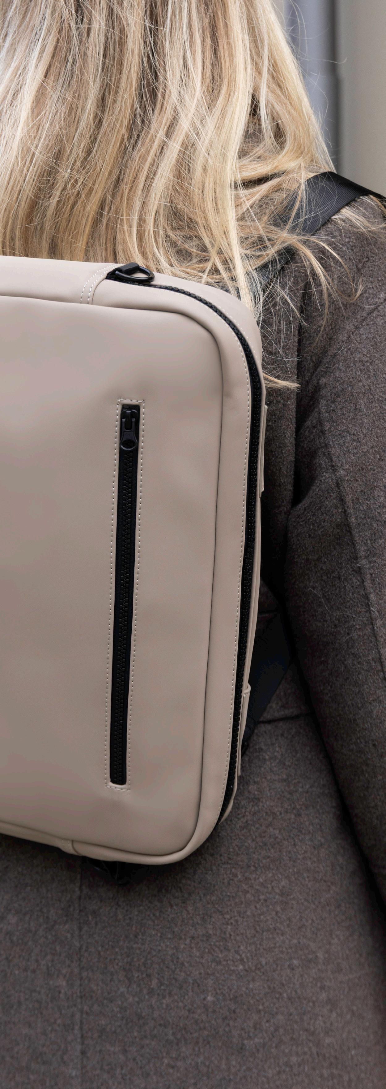 Vannavstøtende • Stilrent PUmateriale • Sykkelvennlig • Glidelås av høy kvalitet • Rom for bærbar PC