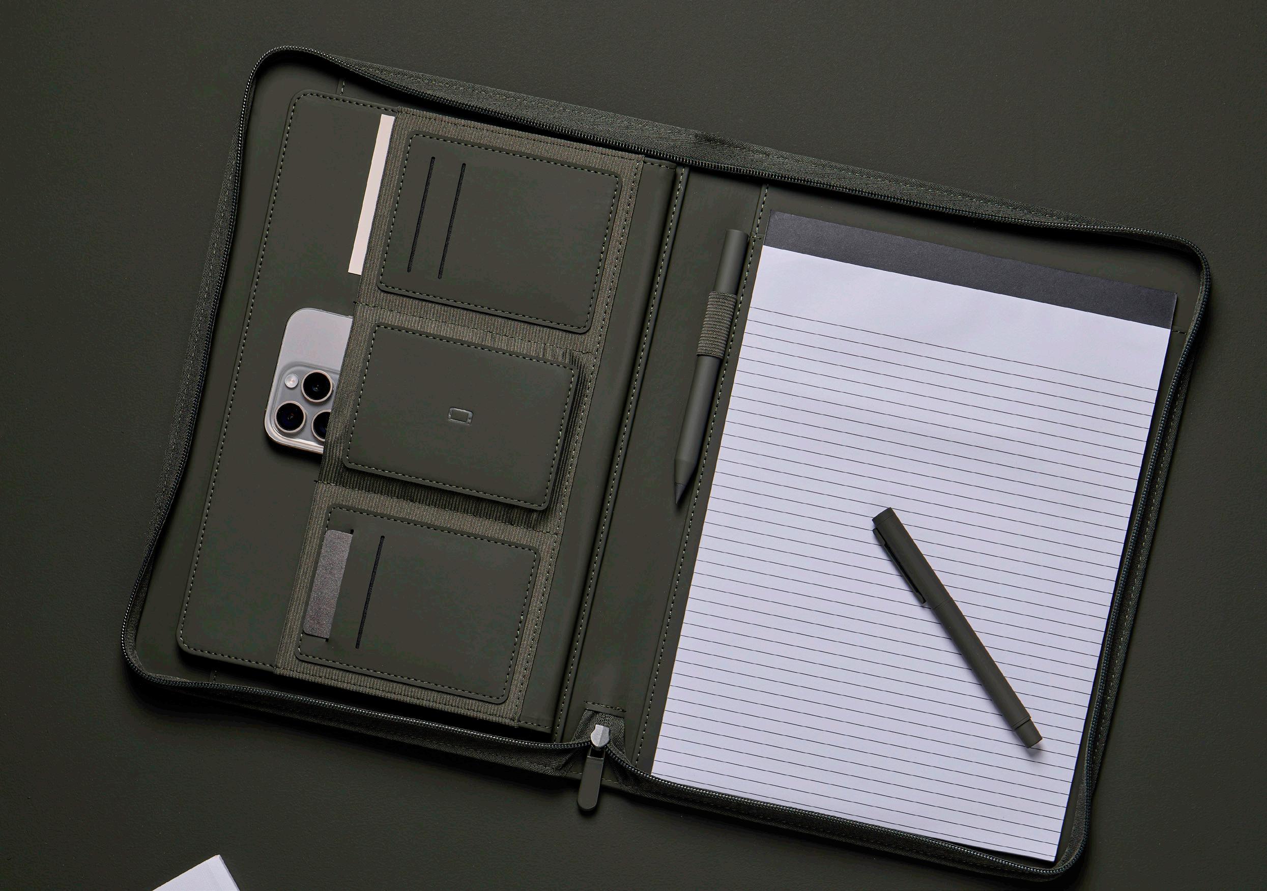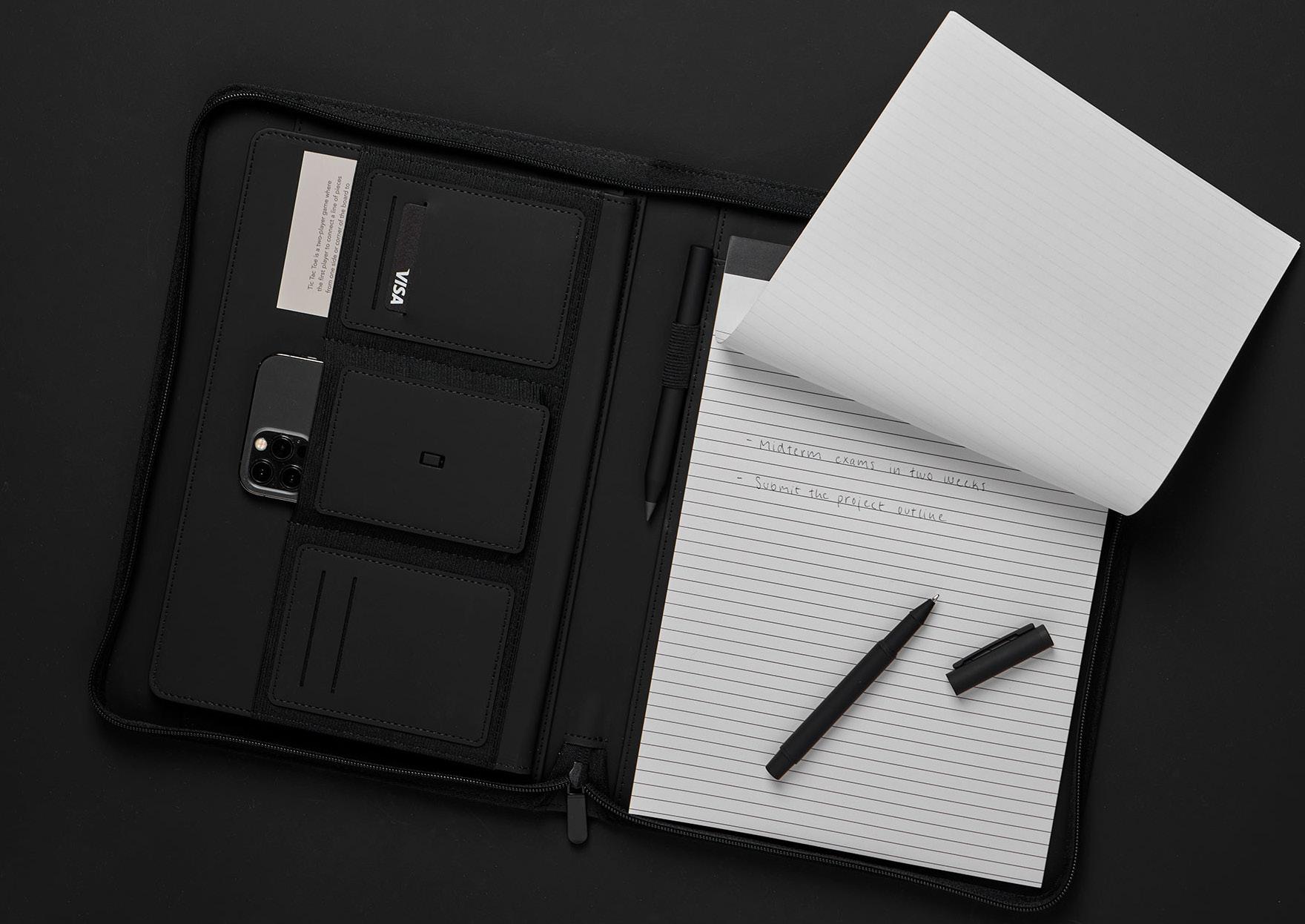 Inkludert notatblokk • Lommer på innsiden • Stilrent PU-materiale • Med pennholder • Perfekt å ta med i et forretningsmøte