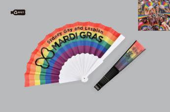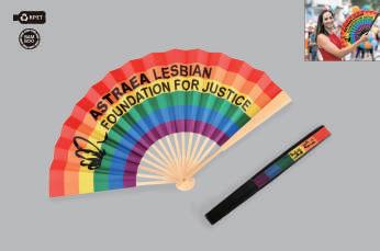 Svalk deg med stil og god samvittighet! Denne fargerike viften er laget av GRS-sertifisert, resirkulert PP og RPET-stof. Det moteriktige regnbuedesignet er bygget for å vare – falmer ikke og avgir ingen lukt. Perfekt for å holde deg sval på konserter, festivaler, klubber, eventer og fester. Leveres med håndtak i standardfargene hvit eller sort. digitaltrykk på den ene siden.