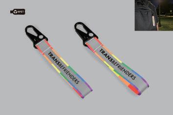 Sikkerhet, bærekraft og regnbuefarger i ett! Denne forlengede refleksstroppen er laget av 100 % resirkulert polyester (RPET) og har et integrert, CE- og EN-17353-godkjent refleksbånd. Den solide karabinkroken sørger for at du lynraskt kan klipse den på sekken eller bagen. Et fantastisk og lett tilbehør som sørger for at du synes i trafikken.