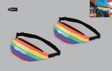 Den ultimate festival- og fritidsvennen! Denne stilige og praktiske rumpetasken er laget av miljøvennlig 600D resirkulert polyester, med innvendig fôr også i resirkulert materiale. Den er helt fri for ftalater og BPA, samt REACH-kompatibel. Tasken har et stort hovedrom med en vid, D-formet åpning for enkel tilgang, i tillegg til en trygg glidelåslomme på innsiden for verdisaker. Det klassiske designet kombinert med friske regnbuefarger gjør den perfekt for turer, trening og fritid. Lett, slitesterk og svært komfortabel å bære. Mulighet for fargetrykk over hele flaten. Minste antall: 100 stk