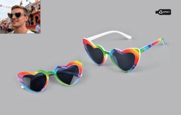 Beskytt øynene dine med stil! Disse unike solbrillene i hjertefasong har PC-linser og ramme/stenger i GRS-godkjent RPET-materiale. Med et fasjonabelt regnbuedesign er de stabile, praktiske og svært komfortable å ha på seg. Optimal øyebeskyttelse for alle utendørsaktiviteter. Hvert par leveres i en myk mikrofiber RPET-pose med snøring. Ti standardfarger er tilgjengelige for linser, Ramme/stenger kommer i hvit standardfarge.