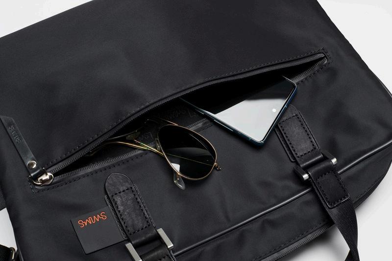 SWIMS Attaché hever pendlingen din med detaljer som både er sofistikerte og praktiske, inkludert luksuriøs nylonkonstruksjon, en robust glidelås og en silikon-grep bunn, et polstret laptop-rom, og en avtakbar skulderreim. Bagens mål: 38 x 29,5 x 28,5 cm.