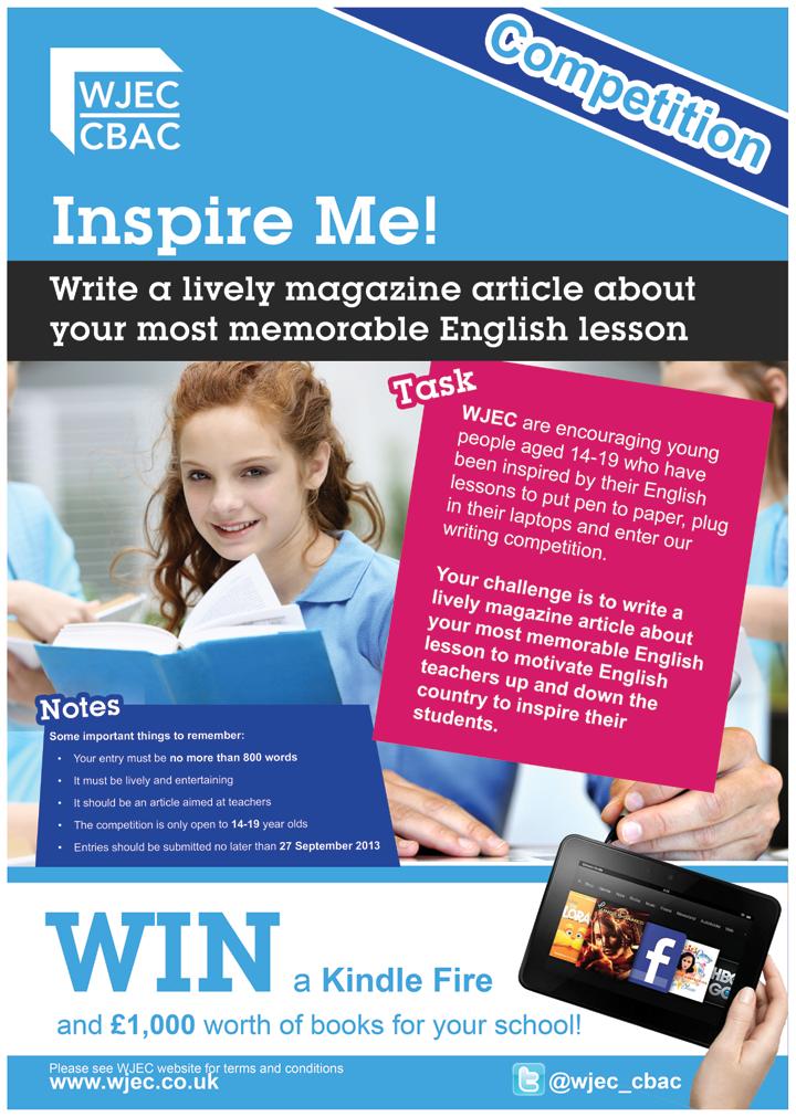 Welcome to the fifth edition of WJEC’s i.e. magazine, which sees the launch of the WJEC Inspire Me! writing competition. The details are included here along with top tips for writing magazine articles – as the shortlisted composition will be featured in the Winter 2015 edition of i.e. And if the lure of being a ‘published writer’ is not enough, there are prizes available for the individual winner and their school or college. Do encourage your students to take part!