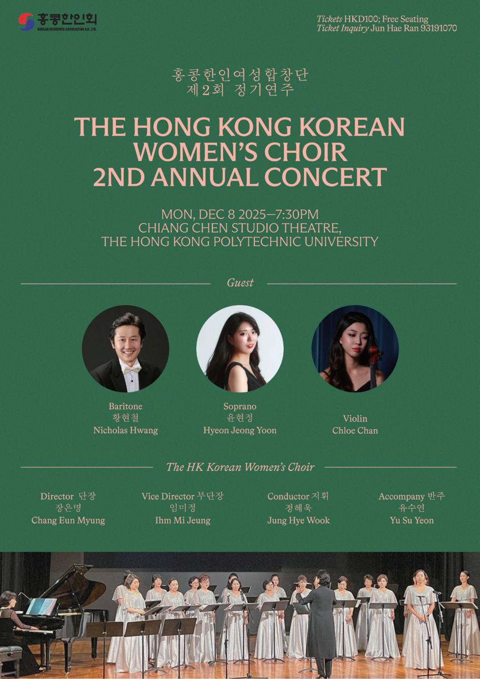 홍콩한인여성합창단(단장 장은명, 지위 정혜욱)이 12월 8일 홍콩 이공대에서 두 번째 공연을 개최한다. 홍콩한인