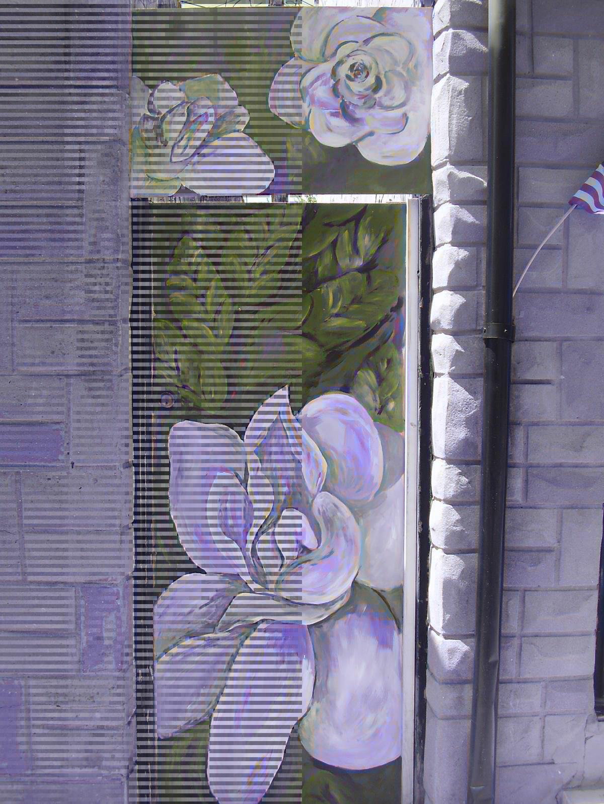 One of the painted window screens, a traditional Southeast Baltimore craft, honoring Billie Holiday’s memory and her signature gardenias at “Lady Day Way” on South Durham Street. Photo via the Baltimore Billie Holiday Project’s Facebook page.
