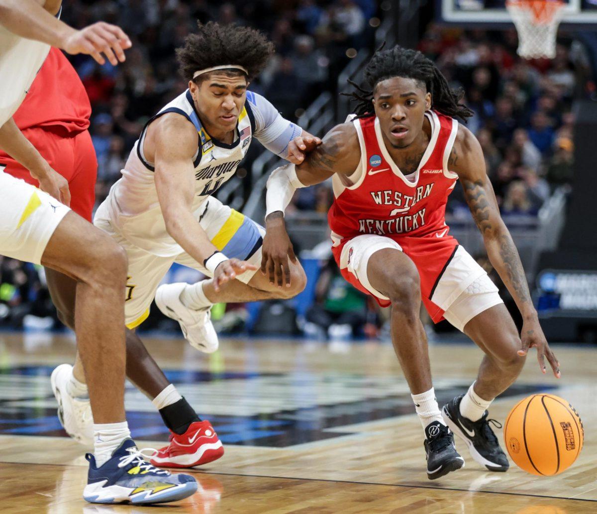 WKU guard Don McHenry (2) drives the lane against Marquette’s Stevie Mitchell (4) during the March Madness Round of 64 at the Gainbridge Field house in Indianapolis on Friday, March 22, 2024. Photo