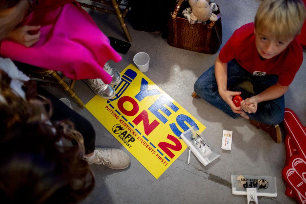 Samuel Towe (right) finds time to play next to his mother Laura Towe before the Americans for Prosperity “Yes On 2” rally at the La Gala event center in downtown Bowling Green, on Monday, Oct. 28, 2024. “I’m fortunate to be able to choose [schools]. I want other families who may not have the means to be able to choose as well,” Laura Towe said.