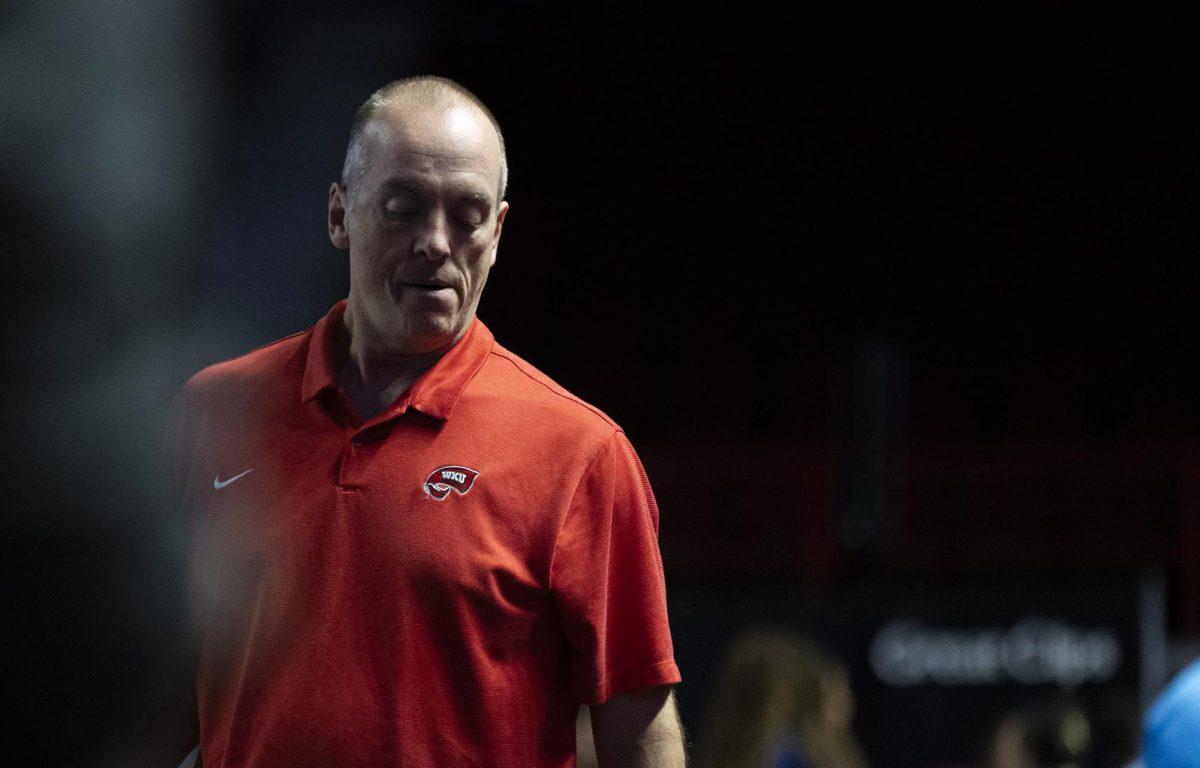 WKU volleyball head coach Travis Hudson prepares for a time out during WKU’s 3-0 sweep of Louisiana Tech on Saturday, Oct. 19, 2024 in Diddle Arena. Photo by Von Smith.