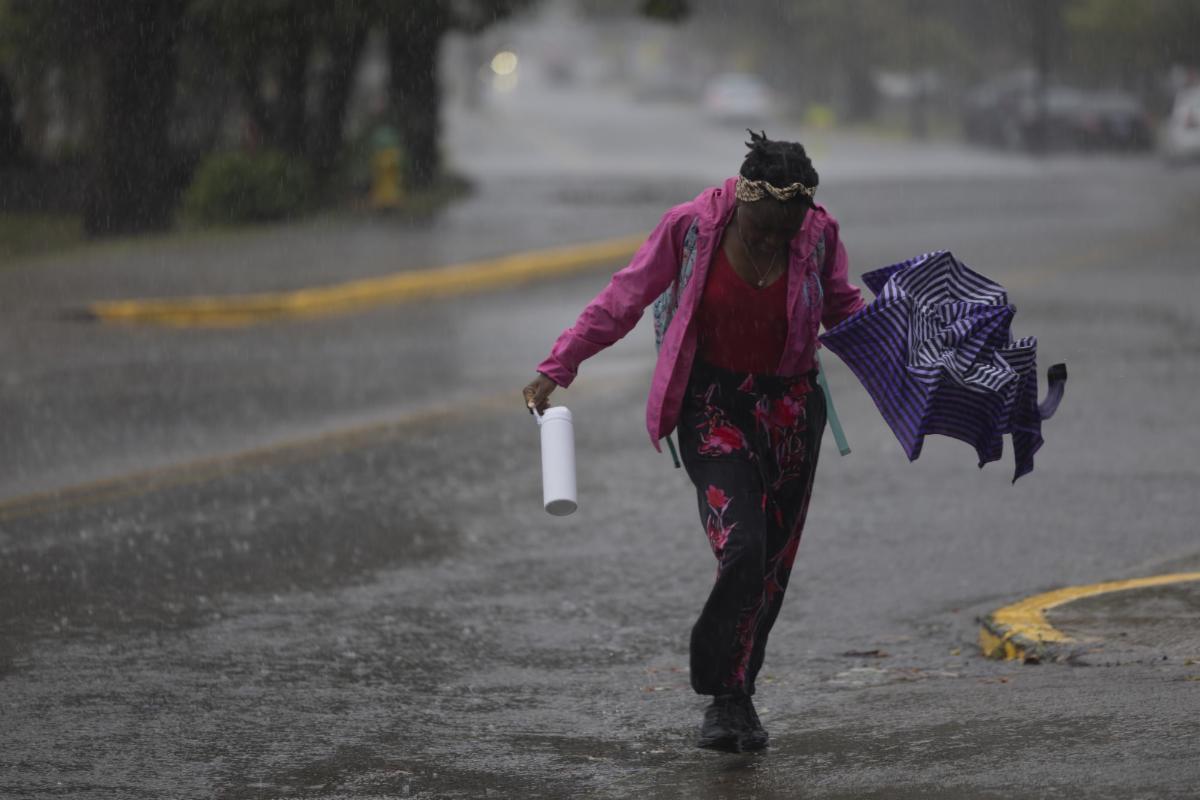 Ancile Igilaneza, freshman, runs to the bus stop cover to dry from the rain on campus Friday, Sept 27, 2024