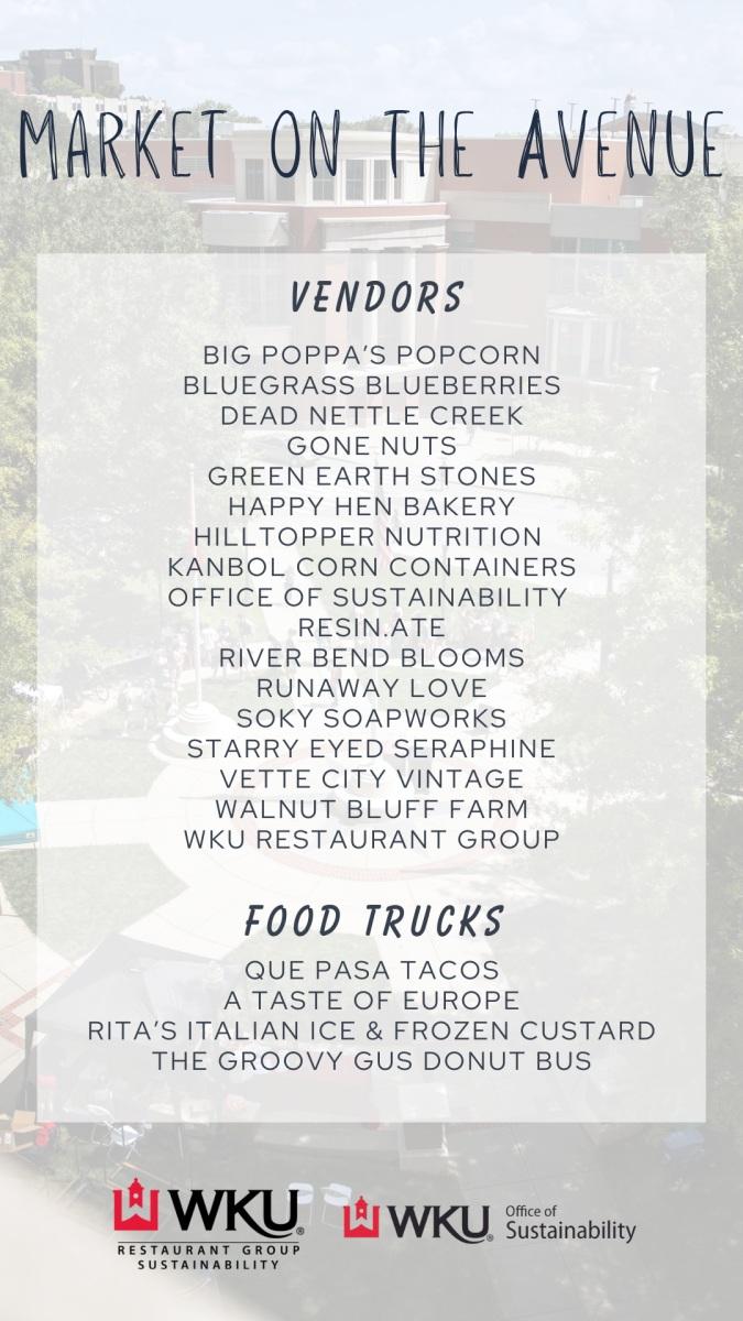 The WKU Office of Sustainability and WKU Restaurant Group will host the first Market on the Avenue of the academic year on Wednesday, Aug. 28. There will be 16 vendors set up at the event including Big Poppa’s Popcorn, Bluegrass Blueberries, Dead Nettle Creek, Gone Nuts, Green Earth Stones, Happy Hen Bakery, Hilltopper Nutrition, Kanbol Corn Containers, Office of Sustainability, Resin ate, River Bend Blooms, Runaway Love, Starry Eyed Seraphine, Vette City Vintage, Walnut Bluff Farm and the WKU Restaurant Group.