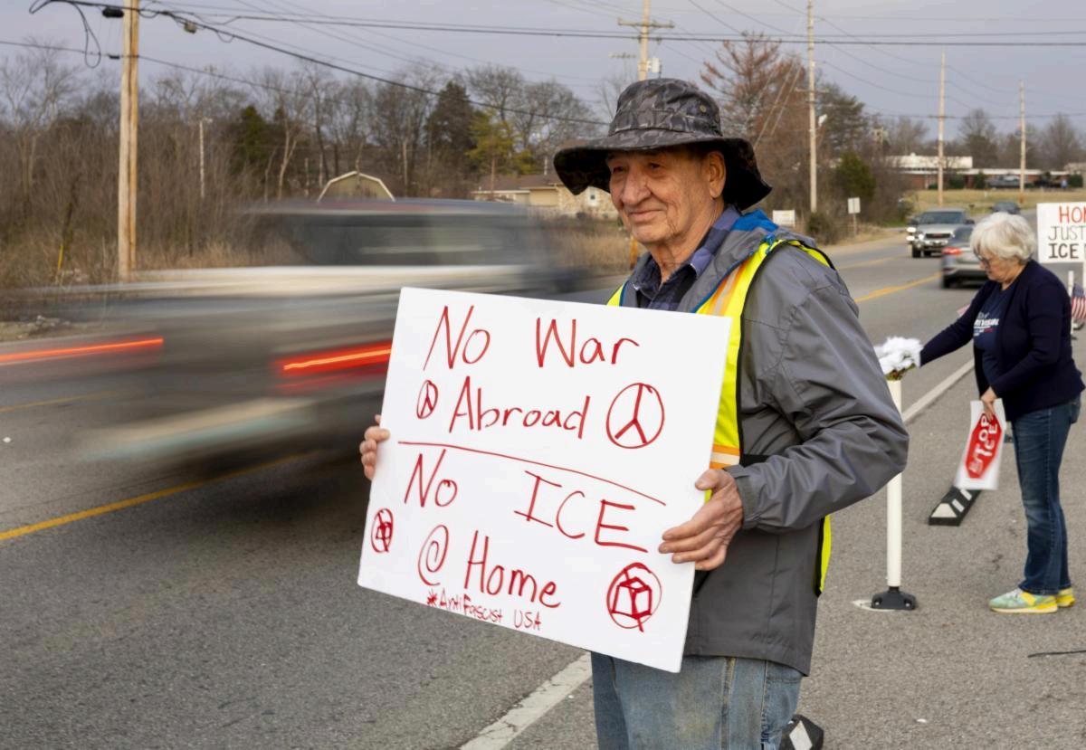Bowling Green native Gail Wolgast holds a sign condemning the military operation in Venezuela during SOKY Indivisible’s protest against Venezuelan President Nicolàs Maduro’s arrest under President Donald Trump on the corner of Nashville Road and Campbell Lane on Monday, Jan. 5, 2026. (Von Smith)
