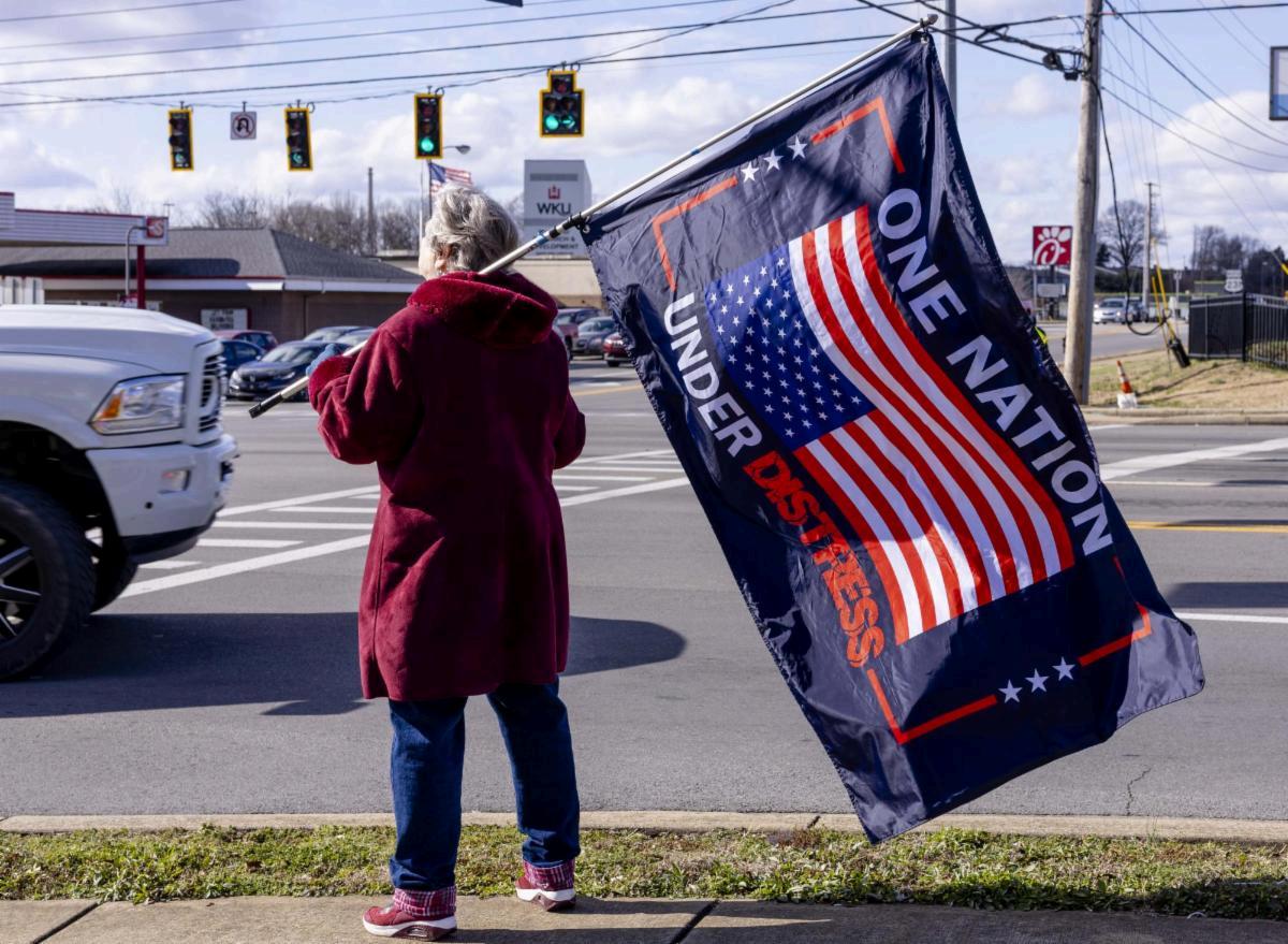 Protester Claudia Hanes waves a flag to oncoming traffic on Saturday, Jan. 17, 2026 during a protest against the Trump administration during a protest on Campbell Ln. (Sam Huffman) Protesters stood on the corners of Nashville Road and Campbell Lane, Saturday, to protest the U.S. Justice Department’s delayed release of documents relating to investigations into convicted sex offender Jeffrey Epstein.