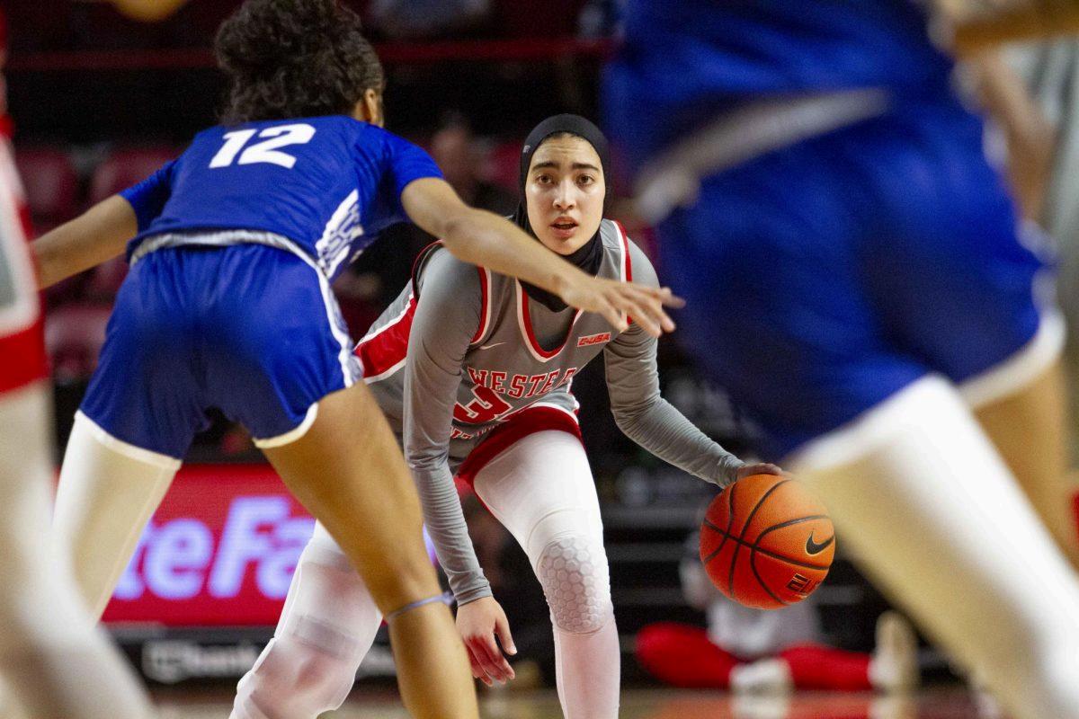 Western Kentucky University Guard Salma Khedr (34) dribbles the ball as Indiana State Guard Kayla Smith (12) attempts to block on Friday, Nov. 14 2025 during the basketball game against Indiana State in E.A. DiddleArena in Bowling Green, Ky.(Natasha Gomez)