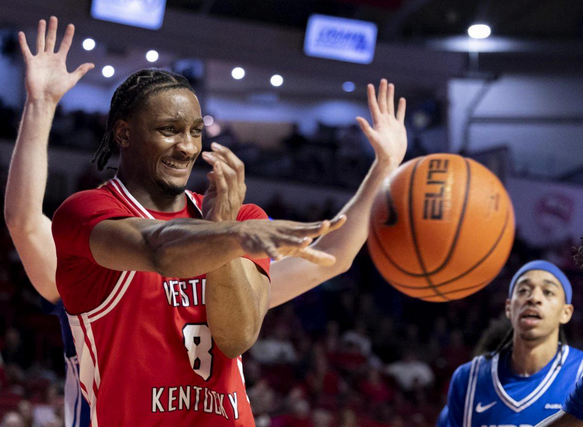 Western Kentucky University Hilltoppers forward Grant Newell (8) throws the ball during WKU’s game against the MTSU Blue Raiders on Saturday, Feb. 14, 2026 in E.A. DiddleArena in Bowling Green, Ky.(Summer Crawford)