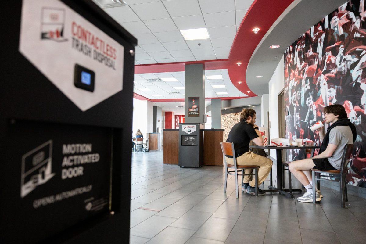 Senior Harrison Resing, left, and alumni Thomas McCoy eat lunch in DSU on Thursday, Feb. 6, 2025 near the new contactless trash receptacles have been placed in DSU. The new trash cans claim to reduce emissions from garbage trucks, use less than $8 of electricity a year and decrease the volume of trash that ends up in landfills.