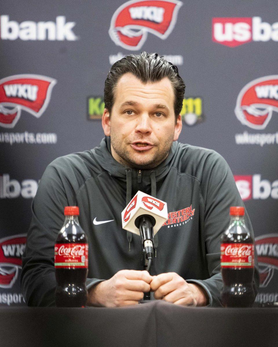 WKU Men’s Basketball Head Coach Hank Plona held a press conference Monday as WKU looks to salvage its underwhelming season in the Paul Just Media Center in E.A. Diddle Arena on Monday, Feb. 9, 2026. The Hilltoppers have struggled in CUSA, accumulating a 13-16 record during 2 seasons under Plona.(Von Smith)