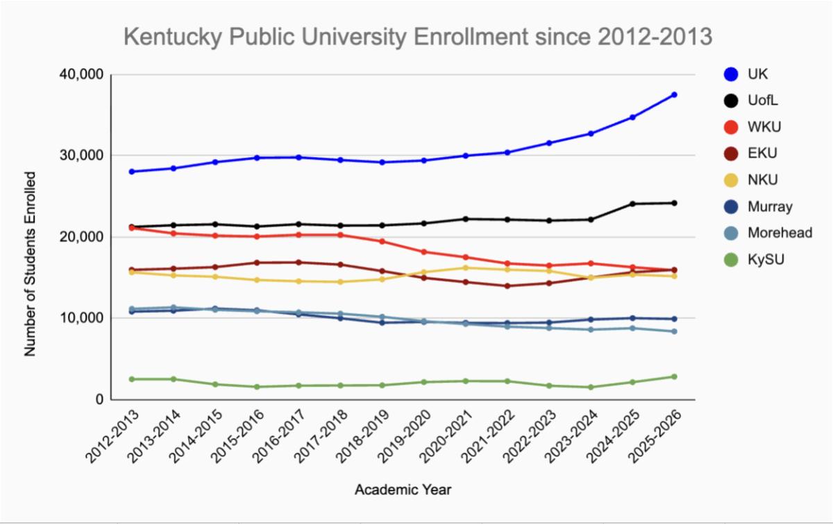 WKU was one of four public universities in the state to see a decline in enrollment alongside Morehead State University, Murray State University and Northern Kentucky University. Overall enrollment in four-year public universities increased from 128,399 in 2024 to 131,634 in 2025.