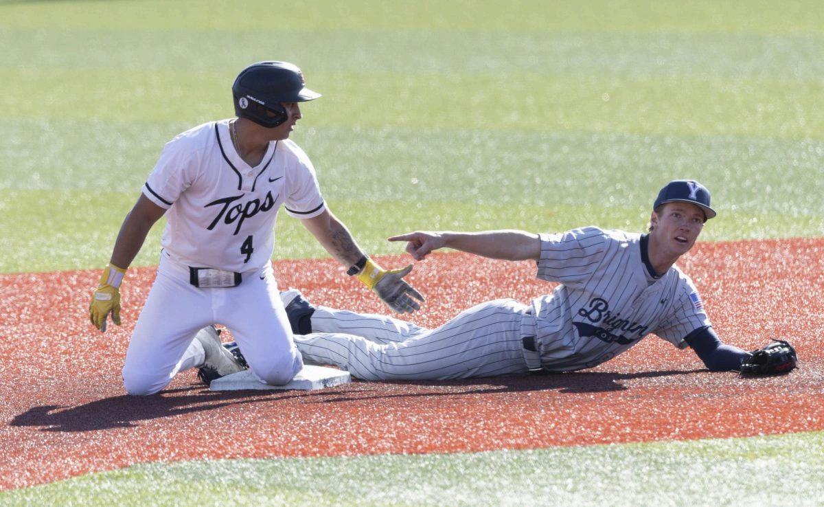 Western infielder JPAcosta (4) argues that he is safe against BYU Infielder Ryder Robinson’s (8) insistence that he isn’t during Western’s game against Brigham Young University on Friday, Feb. 13, 2026 at Nick Denes Field.Acosta was declared not safe.(Jacob Sebastian)