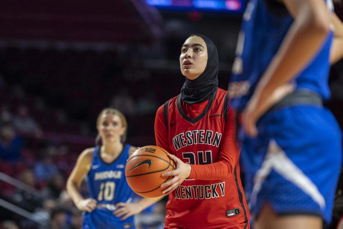 Western Kentucky University’s guard Salma Khedr (34) prepares for a free throw during WKU’s game against MTSU in E.A. Diddle arena on Saturday, Feb. 21, 2026.(Natasha Gomez)
