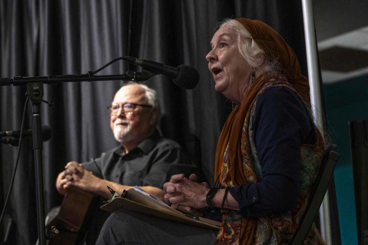 Folklorist Dr. Erika Brady and Kentucky musician Gary Hays speak at the Picking It Up presentation on Saturday, Feb. 21, 2026 at the Kentucky Museum in Bowling Green, Ky During the presentation Brady and other Kentucky musicians explain the significance of the jam session and its role in the history and current state of music in Kentucky. (Sam Huffman)