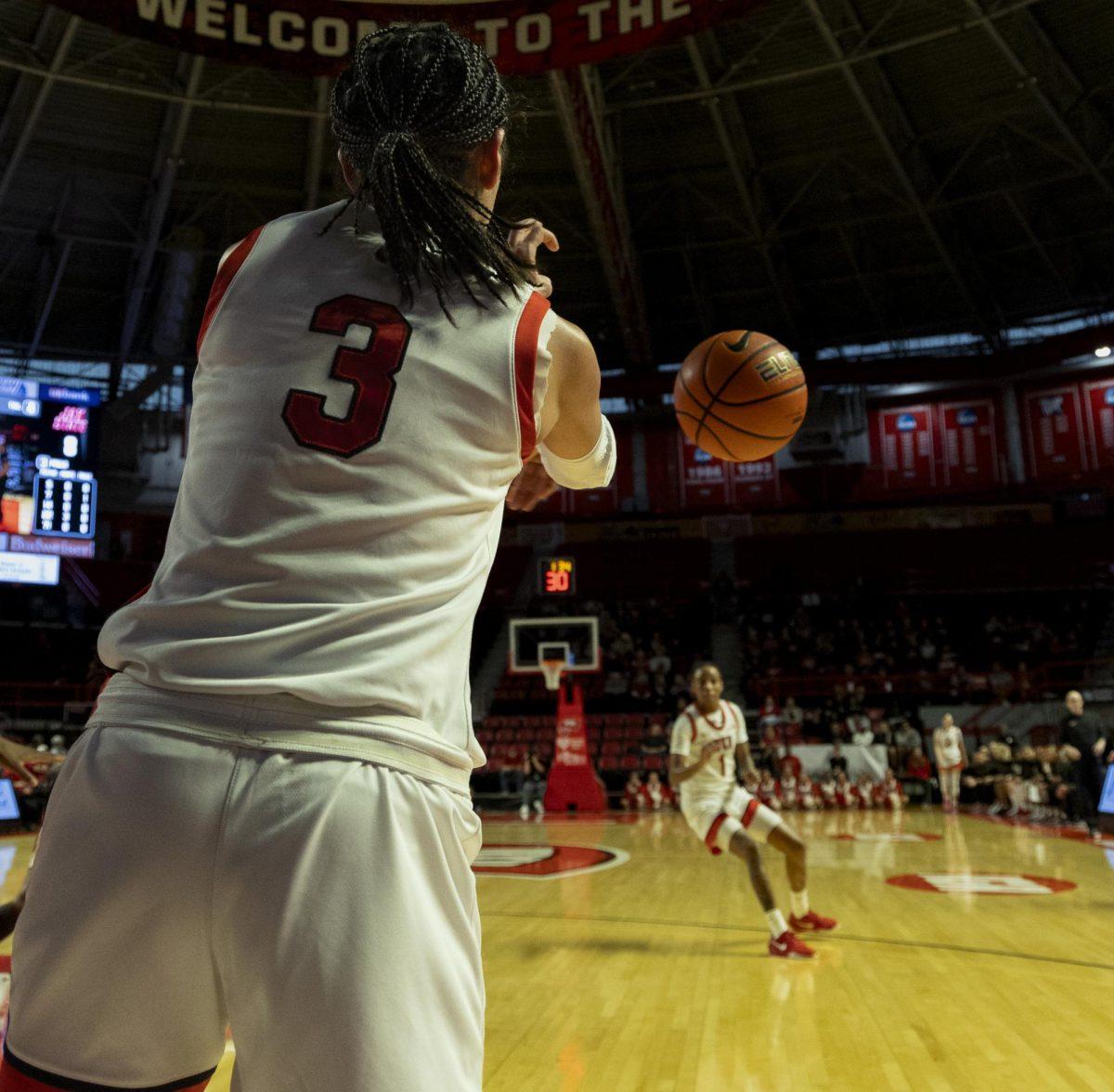 Western Kentucky Lady Toppers guard Alexis Mead (3) inbounds the ball to Western Kentucky Lady Toppers guard Destiny Salary (1) during the matchup against Jacksonville State University in E.A Diddle Arena on Saturday, Feb. 8, 2025. Photo by Ian Pitchford.