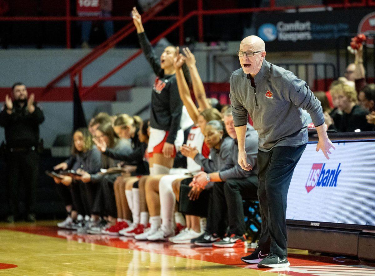 Greg Collins shouts instructions at his team during a game against Sam Houston State University in Diddle Arena on Saturday, Jan. 25, 2025. Photo by Dominic Di Palermo.