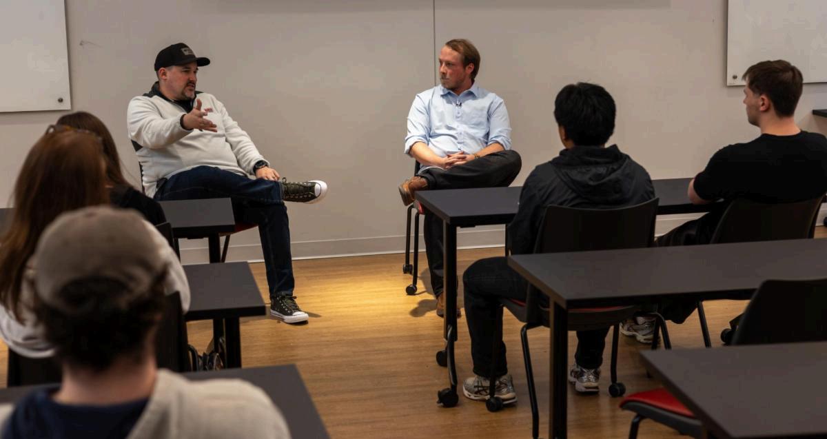 CEO and Founder of Vid Monster Productions, Sam Kirby, and CEO and Founder of Sublime Media Group,AustinAlbany, talked about their experience and answered students questions during the Founder v. Founder event in Chandler Hall on Monday, March 2, 2026. (Bradlee Reed-Whalen)
