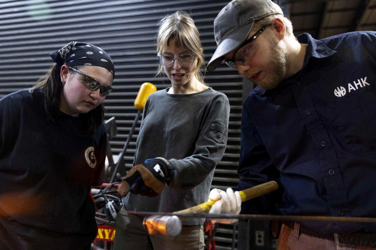 Western Kentucky University instructor of sculpture and 3D designAnna Rafalowski gives advice to Forge Night attendees Harlee Evans and Samuel Bradley on Monday, March 2, 2026 during the League of Sculptor’s Forge Night in Ivan