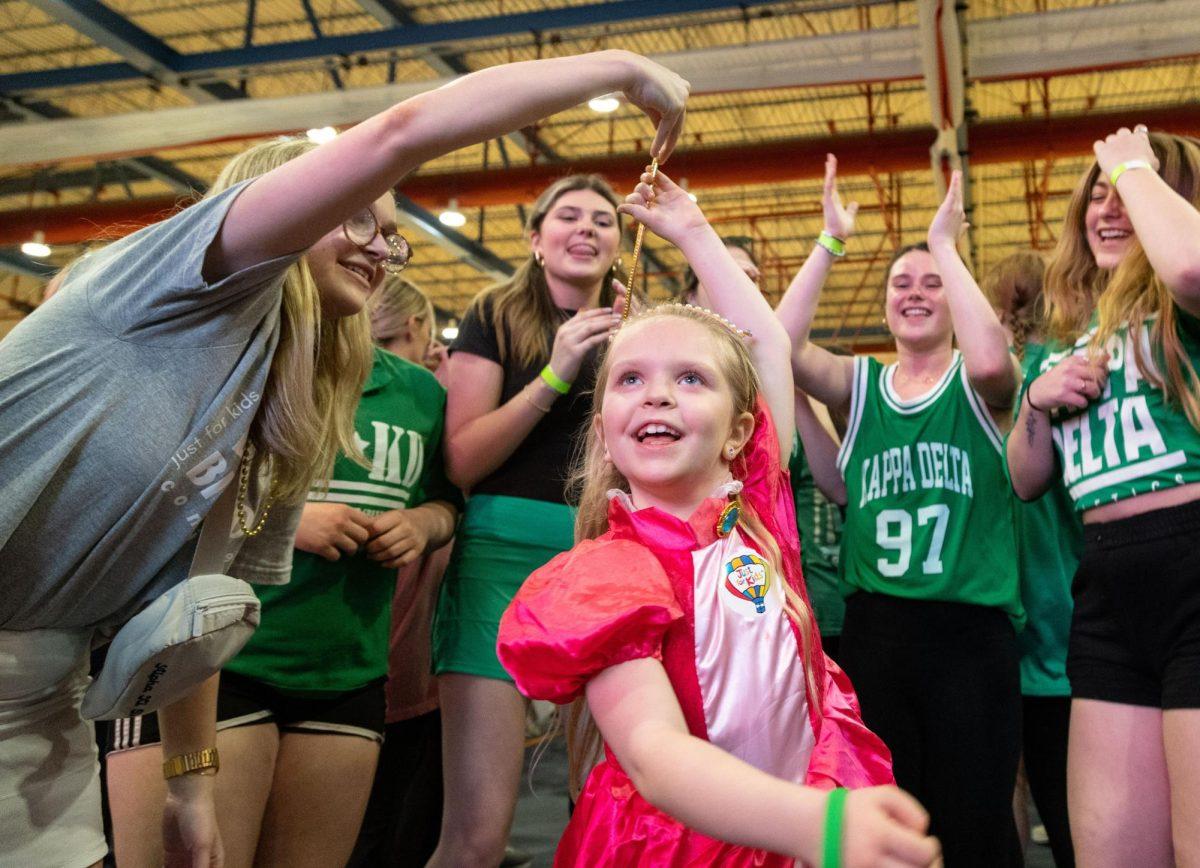 Sophomore Ally Bobb spins Mackenzie Davis, 7, while dancing during Dance Big Red 2024 at the Preston Center on Friday, March 8. The event raised 93,851.99 for Norton Children’s Hospital in Louisville, Ky. Photo by Dominic Di Palermo.