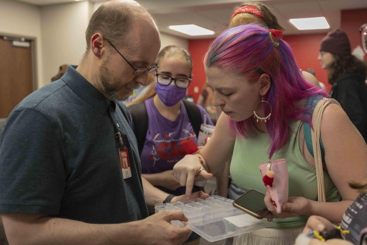 WKU Information Technology Customer Success Team Lead Charles Plemons (left) discusses a trade with sophomore music education major Ginger Pinotti at the TopperFella Trade Day on Wednesday, April 23, 2025. Photo by Price Wilborn.