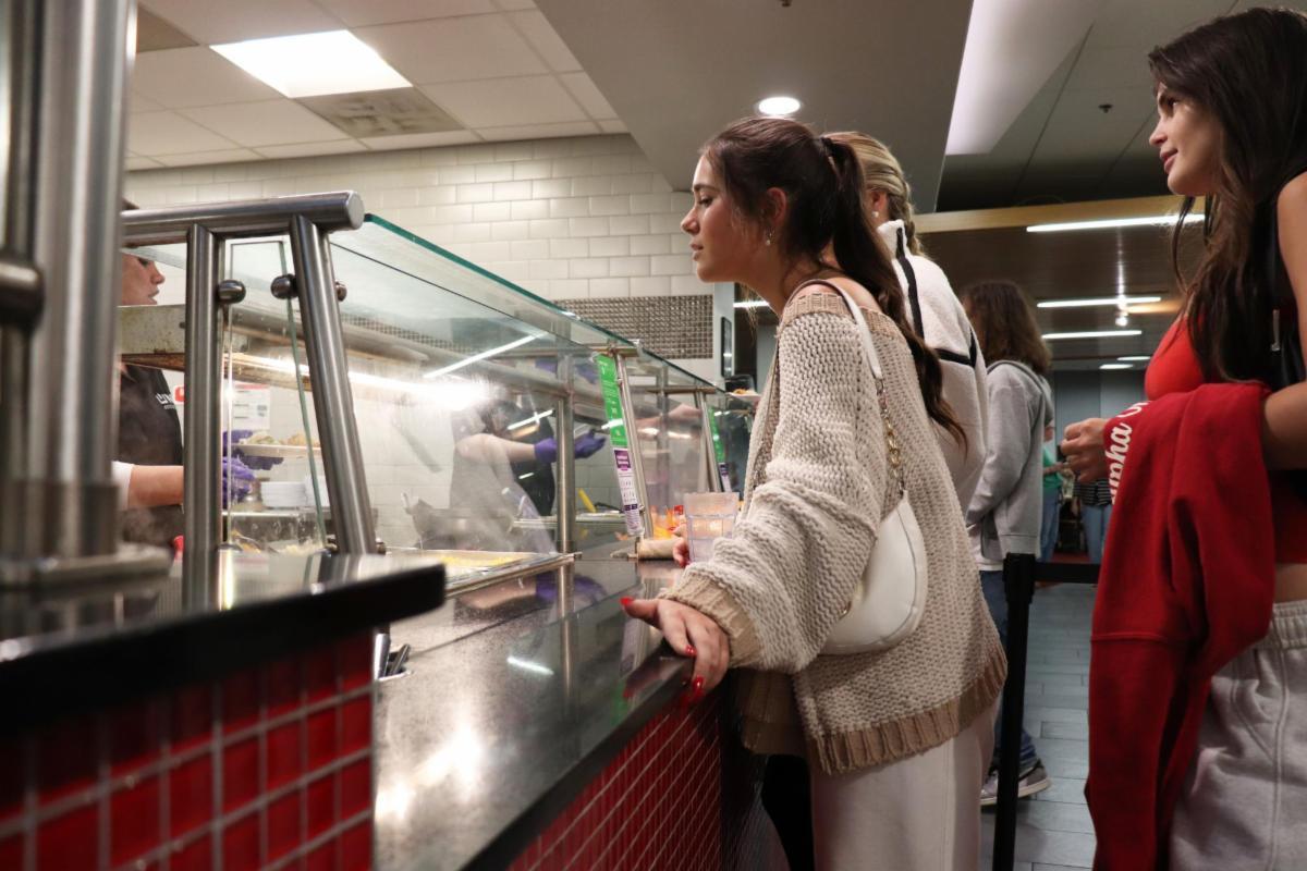 Sophie Burns, a freshman from Nashville and business major, waits for her plate from the food service workers at Fresh Foods Company for her first Friendsgiving on Thursday Nov 20, 2025 (Kane Smith)