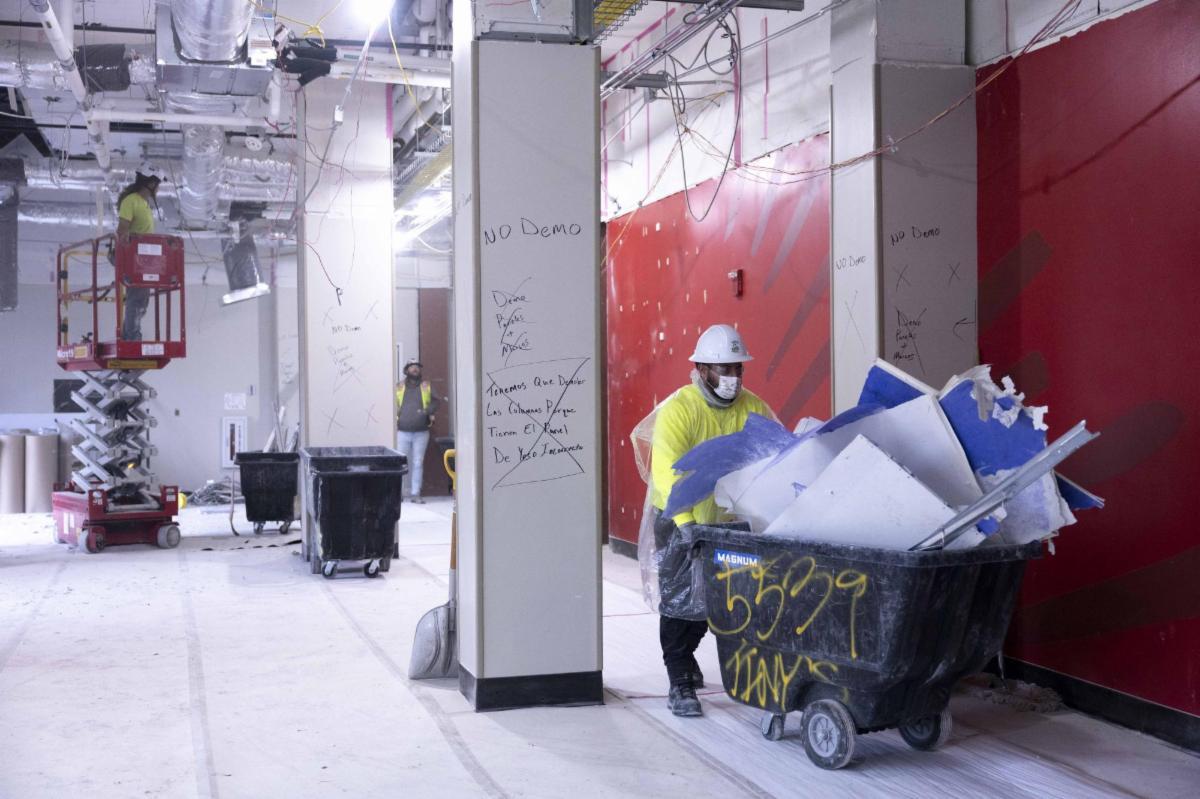 Construction workers tear down the ceiling in the main lobby in Regents Hall on Friday, Nov 21, 2025 (Summer Crawford)