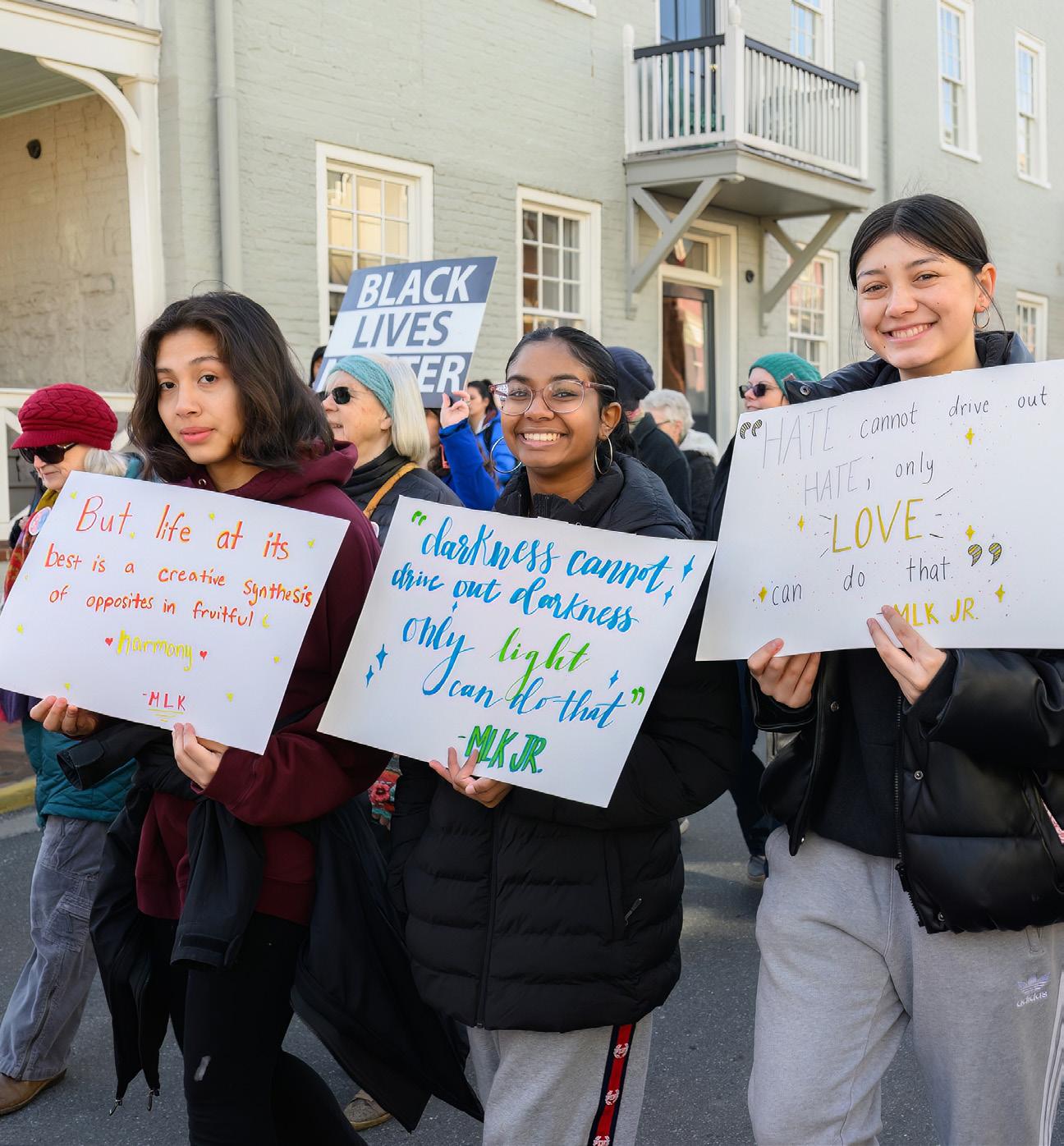 Shepherd students Jess Pacchua ’25, Alina de Zoysa ’25, and P Barnes ’25 march in the local MLK Day parade.