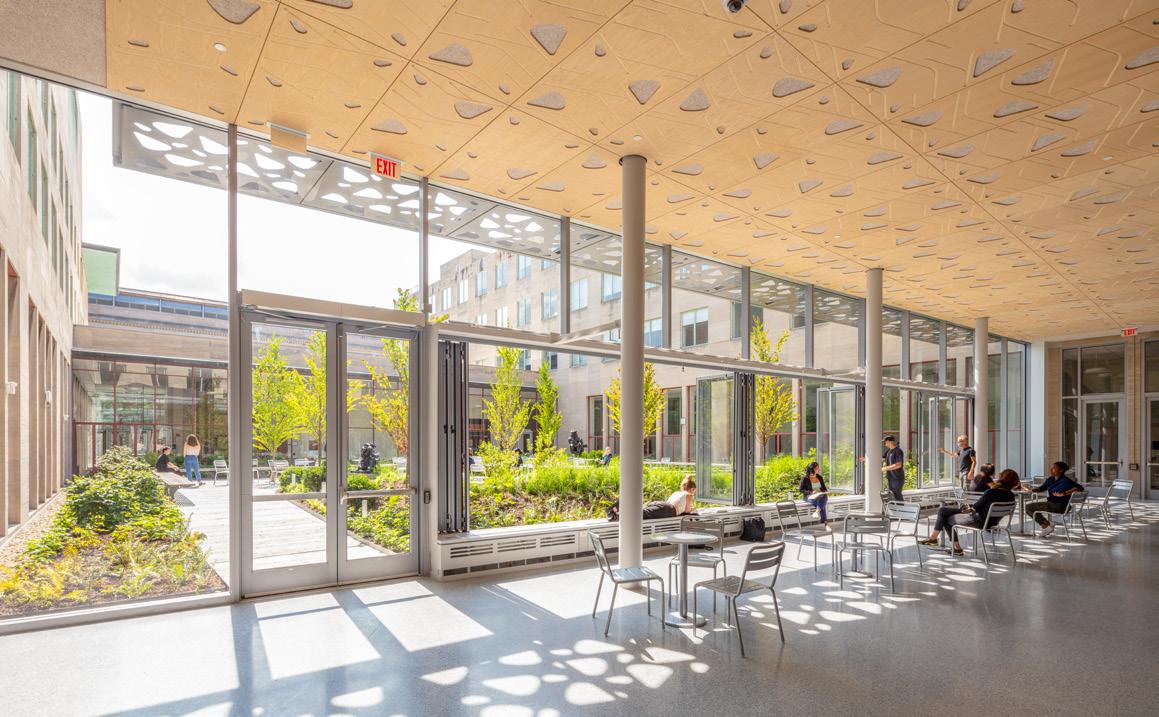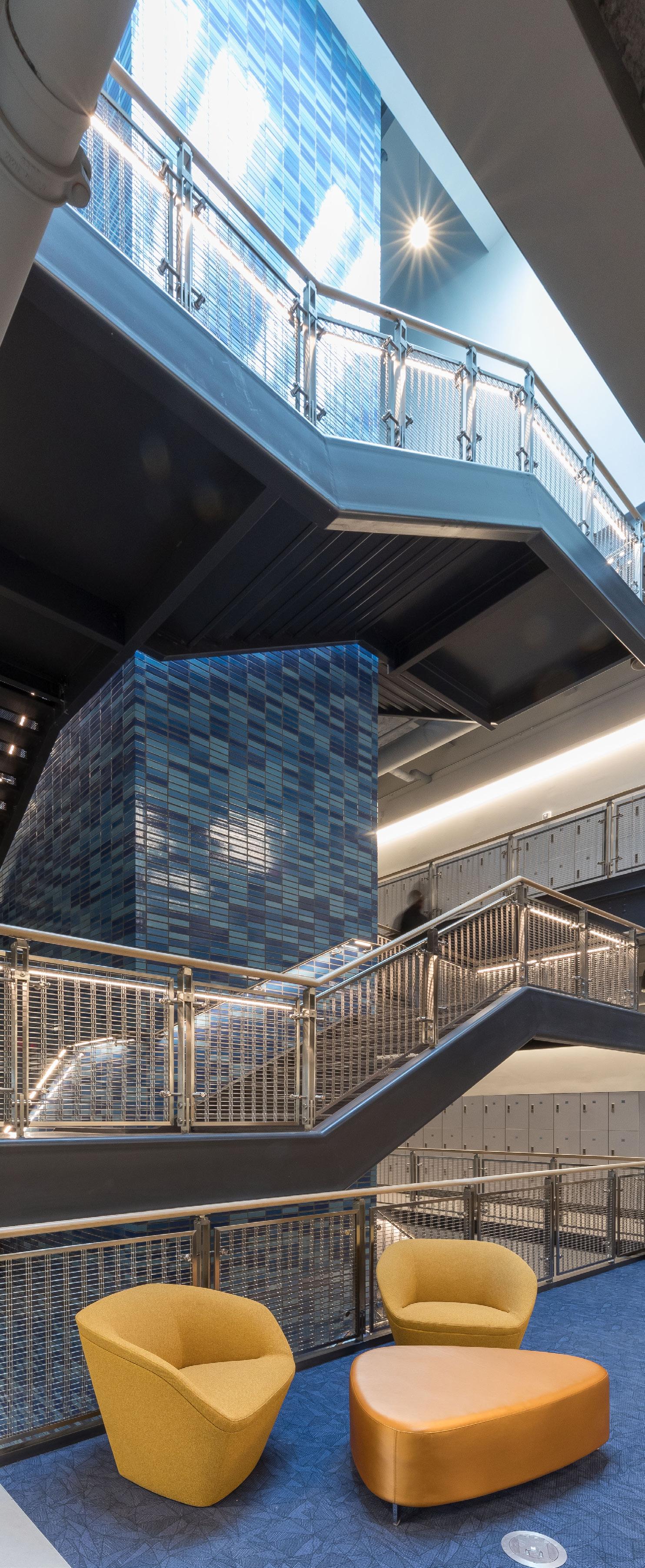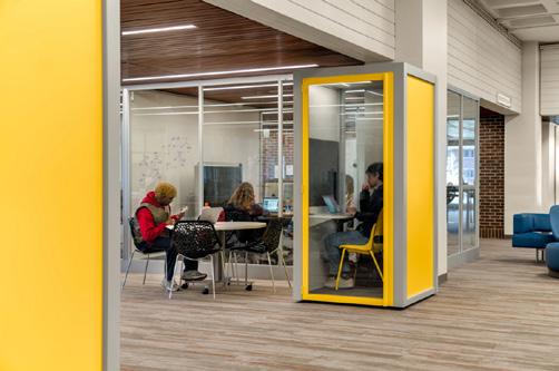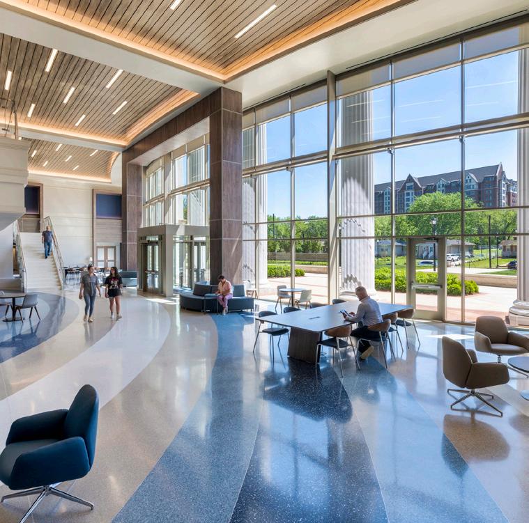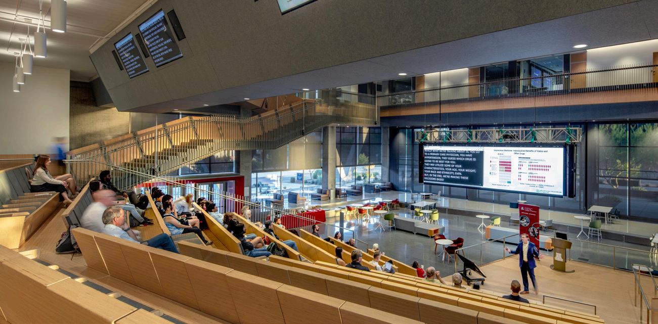 On the first floor, the trading lab displays real-time stock market changes through Bloomberg Technology terminals, giving students access to professionalgrade financial analytics typically reserved for working professionals. Sales classrooms include set-ups of real-world environments that students might encounter when making a sales pitch, blurring the line between academic exercise and professional practice. The most forward-thinking element might be the simulation lab, which uses augmented and virtual reality for marketing strategy exploration. The floor is deliberately furniture-free, allowing for fully immersive AR and VR experiences. It’s a space designed not for how students learn today, but for how they’ll need to learn tomorrow, and return to learn again years from now.