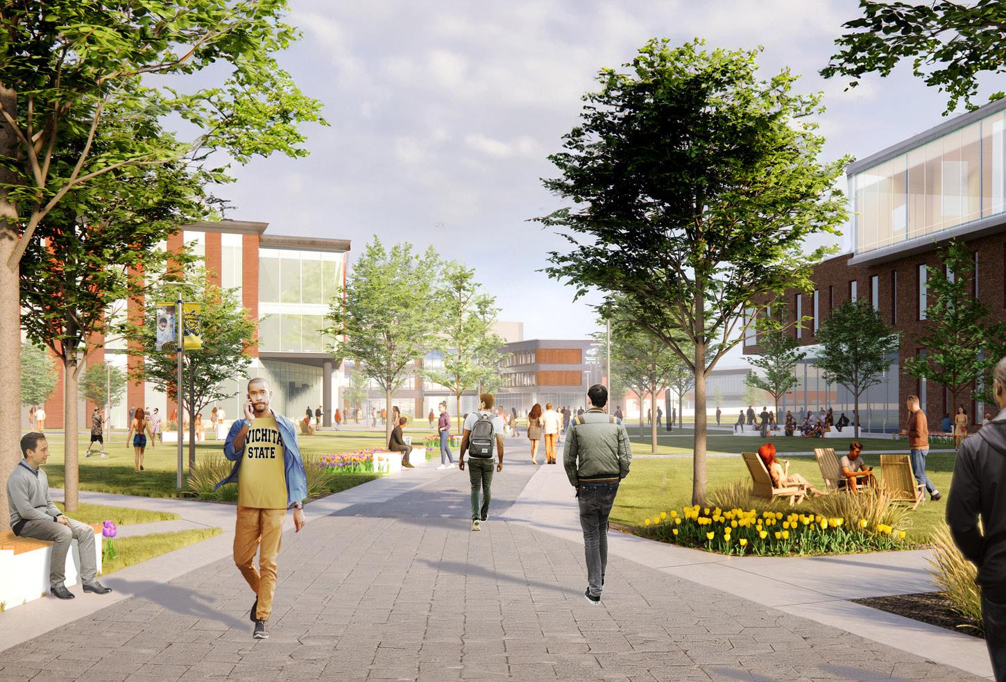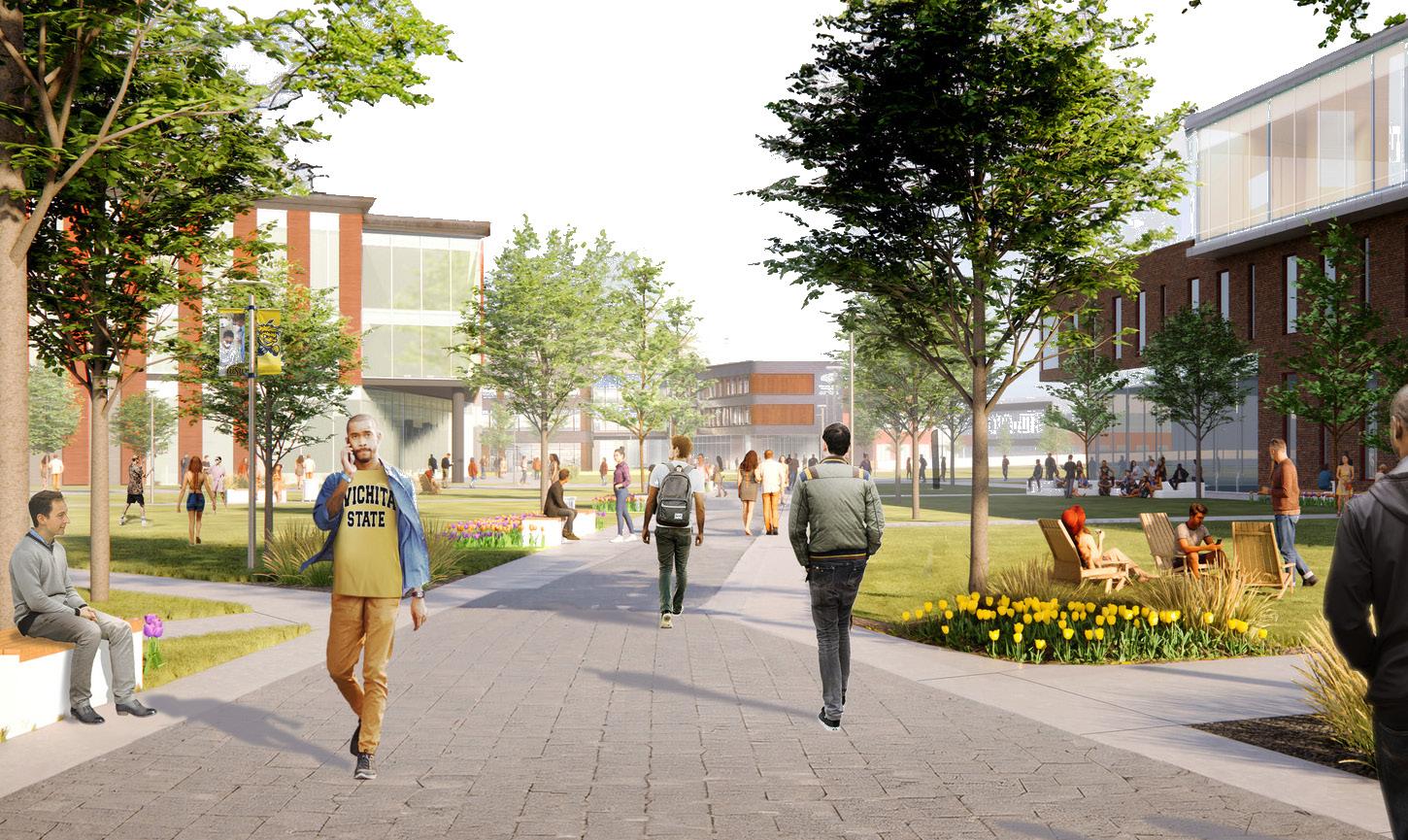 Wichita State University offers a current example of this active transformation. Gensler worked with the university to update its 10-year campus master plan with the goal of creating an “18-hour campus” where students, faculty, staff and the community could connect beyond regular class hours. The master plan unites the academic core and the innovation district with a new main lawn that replaces existing buildings and parking areas, establishing a vibrant main street district that links directly to the surrounding community.