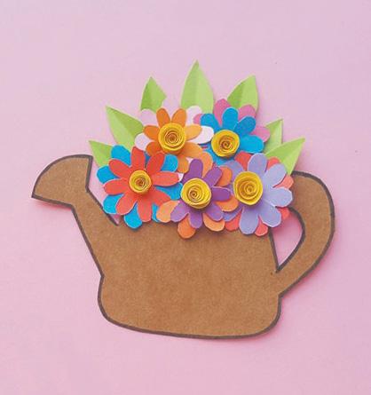 This craft is better suited to older kids and sophisticated enough for grownups to get excited about since it includes quilled flower parts! Just substitute fancier scrapbook paper for the watering can and flowers if you want to upgrade the look; glue to Styrofoam and turn it into a door or wall decoration! You’ll find the tutorial at https:// www.mommymadethat.com/paper-quill-flowers-watering-can/ and the printable template for the pieces at https://www.mommymadethat. com/crafty-resource-library/. (The template wasn’t directly on the page and we had to search for it – a strange setup, in our opinion, but we liked it enough to figure out where it was!!)