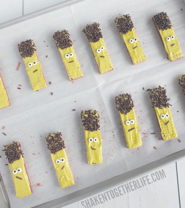 This no-bake treat idea comes from Melissa at Shaken Together Life and you’ll need only a handful of ingredients: chocolate sugar wafer cookies, green chocolate melts, candy eyes, and chocolate jimmies. Melt the green candy in microwave safe bowl—again, 30-second increments are recommended. Dip your wafer cookie and use a popsicle stick to scrape off the excess green chocolate and smooth it out. Spoon jimmies over the top 1/3 of each cookie for Frankenstein’s hair. Finish by placing two eyes and a single jimmy for the mouth using foodsafe tweezers. Full directions can be found at https://www.shakentogetherlife.com/ sugar-wafer-frankenstein-cookies-halloween/.