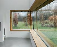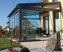 Rechts ein Wintergarten, links verschiedene Fenstermodelle und im Hintergrund die Licht spendende Pfosten-Riegel-Fassade.