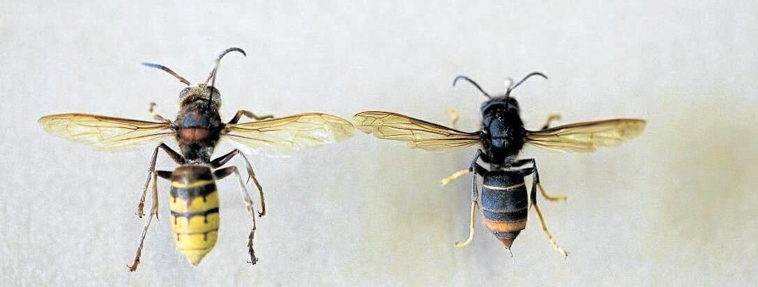 Im Vergleich zur heimischen Hornisse (li.) ist die Asiatische Hornisse (re.) deutlich an den gelben Beinenden zu erkennen. Foto: Bayerische Landesanstalt für Weinbau und Gartenbau (LWG)