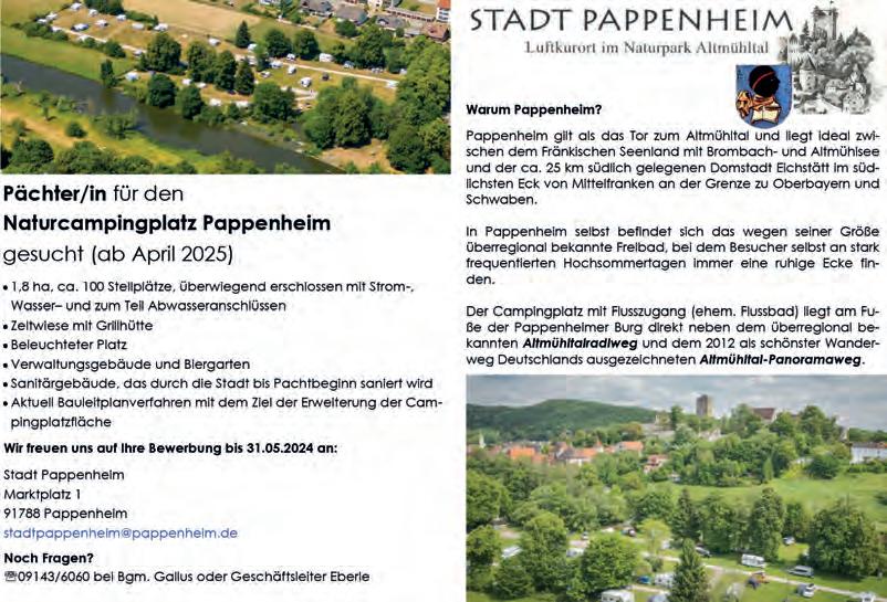 www.moebel-rachinger.de Industriestraße 1 | 91807 Solnhofen | moebel-rachinger.de MO-FR 9-18 Uhr | DO 9-20 Uhr | SA 9-16 Uhr FÜR IHR ZUHAUSE WOHNEN | KÜCHEN | BÖDEN | TÜREN MÖBEL RACHINGER Industriestraße 1 | 91807 Solnhofen | moebel-rachinger.de Neue Öffnungszeiten: DI FR 9 - 18 Uhr | DO 9 - 20 Uhr | SA 9 - 16 Uhr Ab jetzt bei uns! wegen Kollektionswechsel Rausverkauf Ausstellungsstücke www.moebel-rachinger.de 44% radikal reduziert! bis zu Schöne Möbel Ausstellung 4 ra 4 dikal A zu sstellu Neuwertige Möbel– stark reduziert, sofort verfügbar! Rabatte gültig bis zum 30.03.2024 und nicht kombinierbar! Ostern geöffnet: Rad- und Rikschavermietung in Ramsberg, Langlau und Enderndorf Mehr erleben Großer Osterund Jahrmarkt am Ostermontag, den 01. April 2024 in Treuchtlingen Bahnhofstraße und Wallmüllerplatz Tel. 09852/908975 Bierteufel SCHLOSSBRAUEREI ELLINGEN Der Bierteufel ist zurück! Ab Karfreitag, 29. März 2024, wieder ganztägig ab 10.00 Uhr geöffnet. • Durchgehend