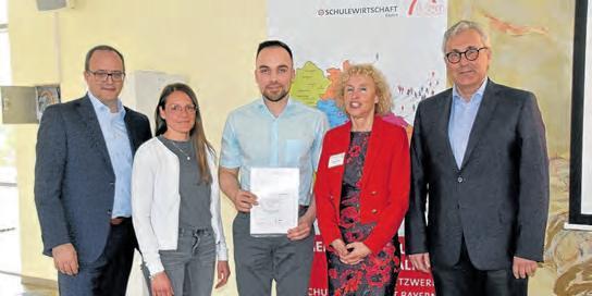 Freuen sich über den Neustart des Netzwerkes: (v. l.) Landrat Manuel Westphal, Lena Deffner (Ansprechpartnerin fürdas Netzwerk), Johannes Höglmeier (Leiter Wirtschaft), Schulleiterin Susanne Weigel und Dr. Jürgen Hollatz (Landesgremium Schule/Wirtschaft).