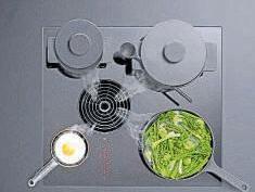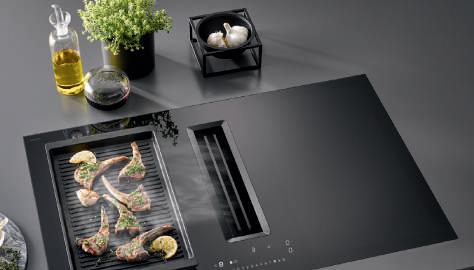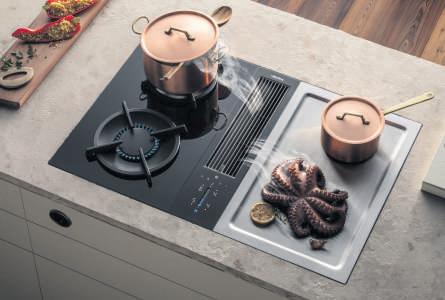 Mit einem Designpreis ausgezeichnete Kochfeldabsaugung für die Montage in einer Küchenzeile oder Insel. Das kraftvolle, 10-stufig regelbare Lüftersystem schaltet sich bei Nutzung einer Kochzone automatisch ein. Foto: AMK