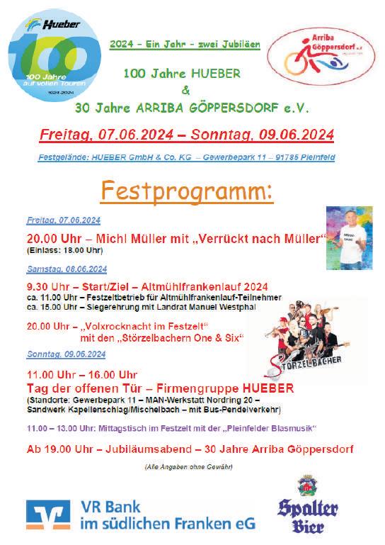 100 Jahre Hueber und 30 Jahre Arriba Göppersdorf e V wird von 7. bis 9. Juni in Pleinfeld gefeiert.