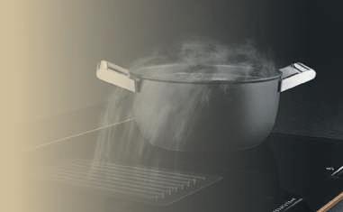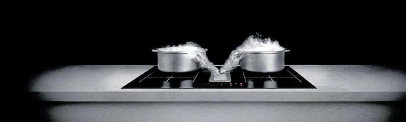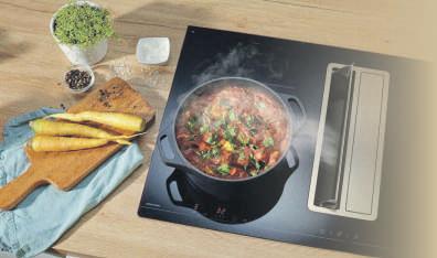 Beispiel in einen bodenlosen Oberschrank vollintegriert beziehungsweise flächenbündig eingebaut. Dank eines platzsparenden, kompakten Designs bietet diese Einbauvariante zusätzliche praktische Ablagemöglichkeiten direkt rechts und links neben dem Haubenkörper Damit sich Licht und Lüftung beim Kochen einschalten, wird der elegante Glasschirm mit dem Touch-Bedienfeld einfach ausgeklappt. Beim Zuklappen schaltet sich die vollintegrierte Haube wieder aus Eine weitere dezente optische Lösung sind Kochfelder mit einem flächenbündig integrierten Dunstabzug, der Gerüche und Kochschwaden effizient nach unten absaugt. Mit ihrem minimalistischen Design sowie ihrer flachen Bauweise fügen sich diese 2in1-Modelle überall in jede Küchenarchitektur ein. Ob mit einem runden oder rechteckigen Abzugsmo-