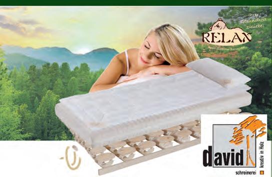 (red). Erfahrung, Traditionsbewusstsein und Innovation im Handwerk prägen die Schreinerei David. Kundenorientiertes Denken und Handeln ist für das Familienunternehmen ebenso selbstverständlich wie eine umweltfreundliche und nachhaltige Produktion. Dabei ist die Schreinerei David auch ein kompetenter Partner in Sachen gesunder Schlaf und bietet mit Relax 2000 ein einzigartiges System an.