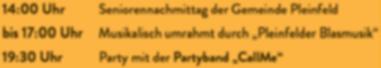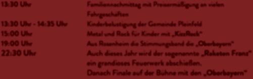 und abends im Festzelt „CallMe“, am Sonntag die Pleinfelder Blasmusik (Frühschoppen) und nach dem Festzug im Festzelt die Frankenland-Musikanten sowie amMontag KizzRock (Kindernachmittag) und „Die Oberbayern Am Freitag wird um 18.30