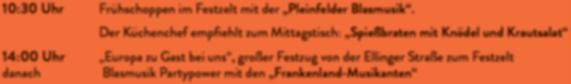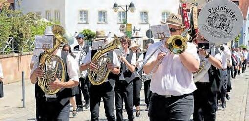 eine, des Brauchtums & der Tradition! Vormittags wird zu einem Frühschoppen mit musikalischer Umrahmung durch die Pleinfelder Blasmusik eingeladen. Dazu gibt es ein leckeres Mittagessen im Festzelt. Nachmittags findet wieder ein Festzug unter dem Motto „Europa zu Gast bei uns“ statt. Der Festzug startet um 14.00 Uhr in der Ellinger Straße Zahlreiche Pleinfelder Vereine und Gruppen zeigen dabei, wie bunt und vielfältig das Vereinsleben in Pleinfeld ist. Anschließend sorgen die FrankenlandMusikanten im Festzelt für